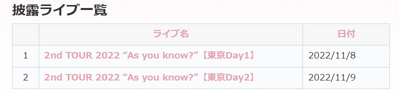 後述の「披露ライブ一覧」にて披露されたライブが確認できる